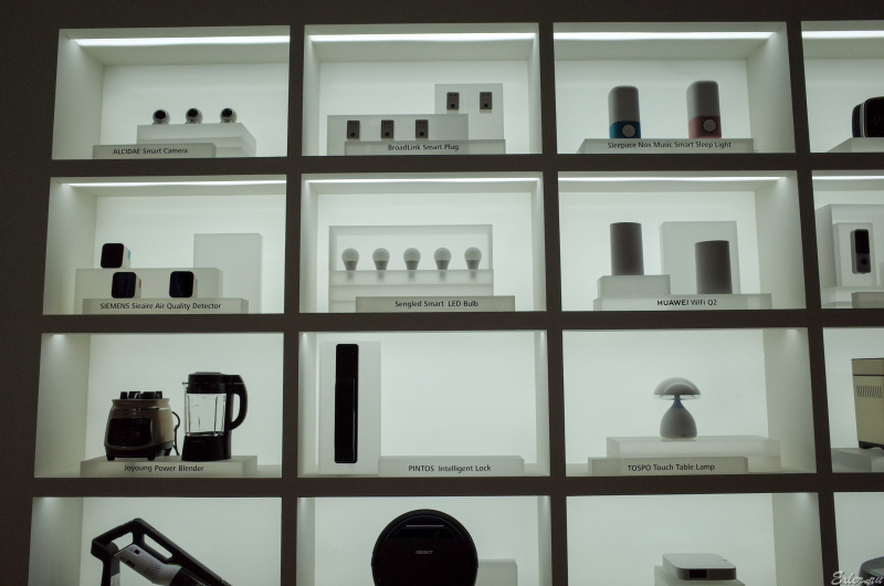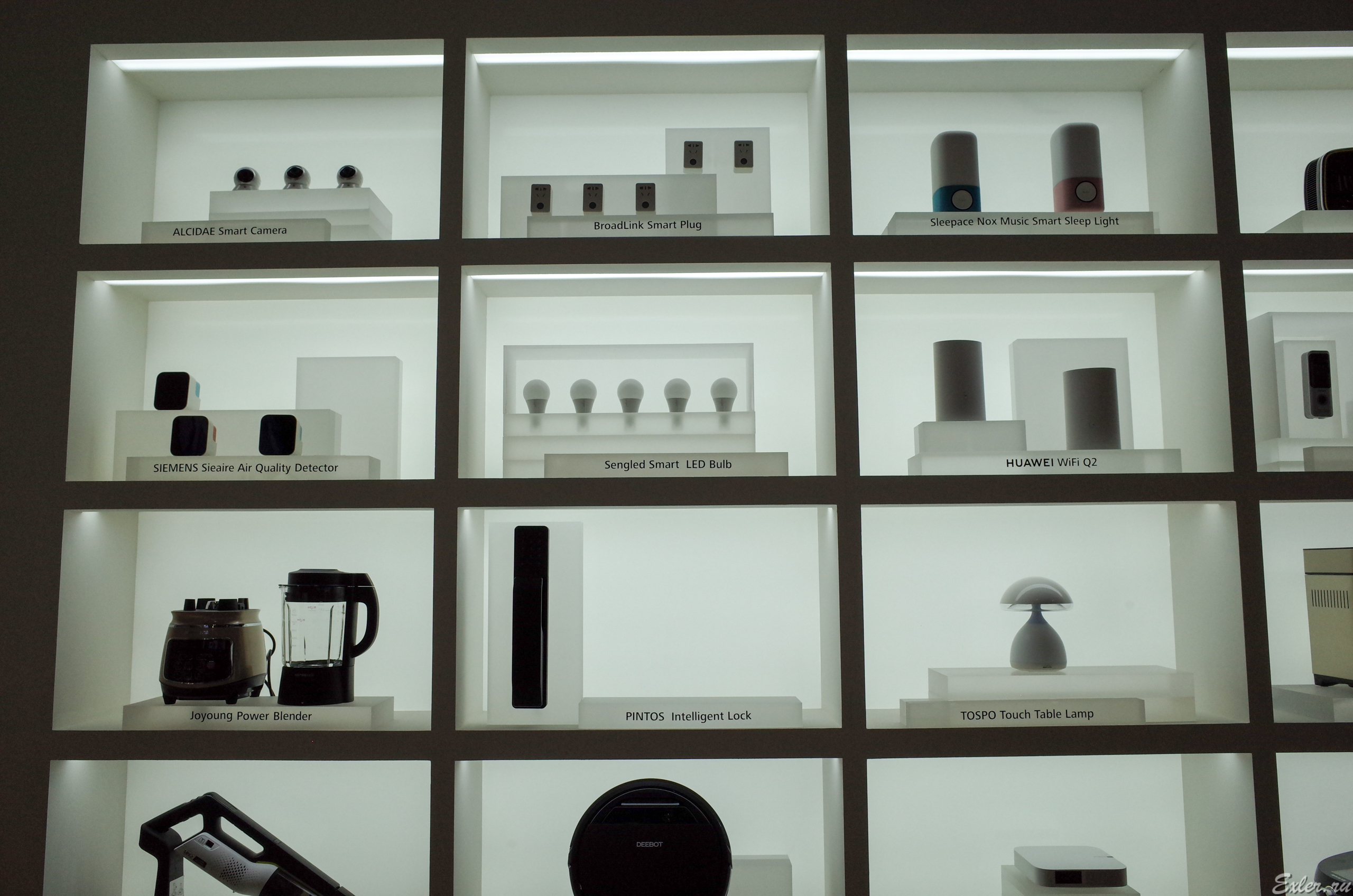 Стенд, на котором представлены всевозможные устройства умного дома, использующие платформы Huawei.