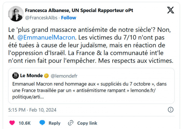 Комментируя пост издания Le Mond с цитатой президента Франции Эмманюэля Макрона с осуждением антисемитизма, Альбанезе не согласилась с тем, что нападение ХАМАС на Израиль 7 октября было связано с антисемитизмом. "Величайшая антисемитская резня нашего века? Нет, господин Макрон. Жертвы 7 октября были убиты не из-за своего иудаизма, а в ответ на угнетение со стороны Израиля. Франция и международное сообщество не сделали ничего, чтобы предотвратить это. Мое почтение пострадавшим", - написала спецдокладчик ООН.