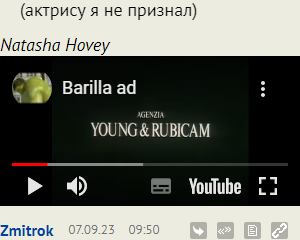 В ТГ Ольги Романовой увидел интересное - реклама пасты Barilla в 1989 году авторства Никиты Михалкова. В ролике снялись Всеволод Ларионов и Юрий Богатырев (актрису я не признал).