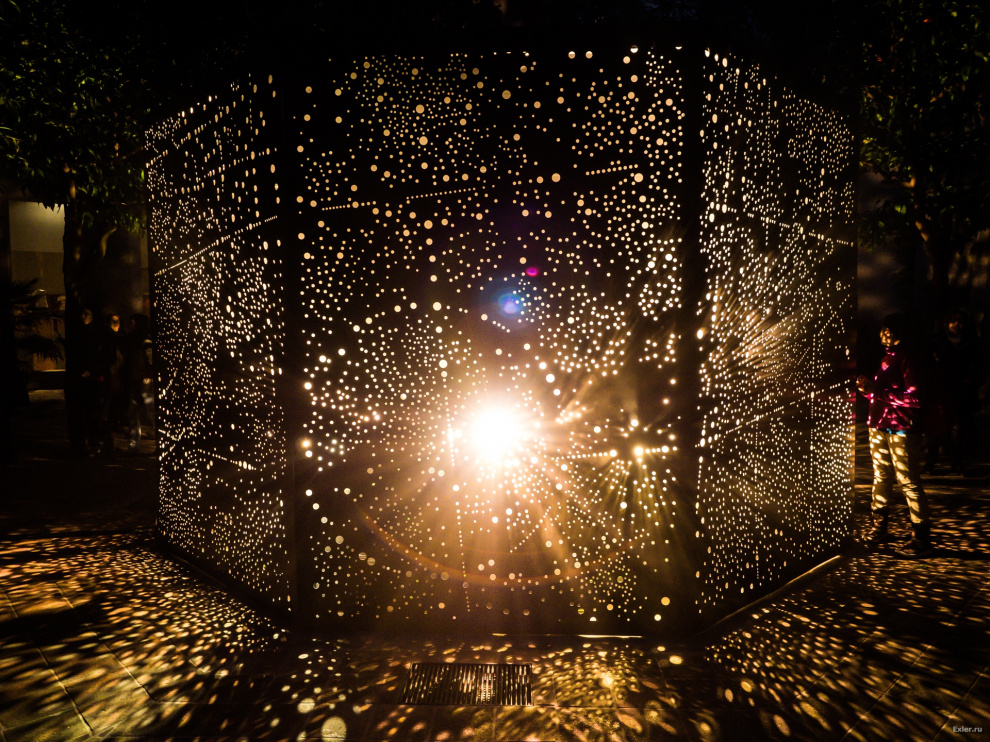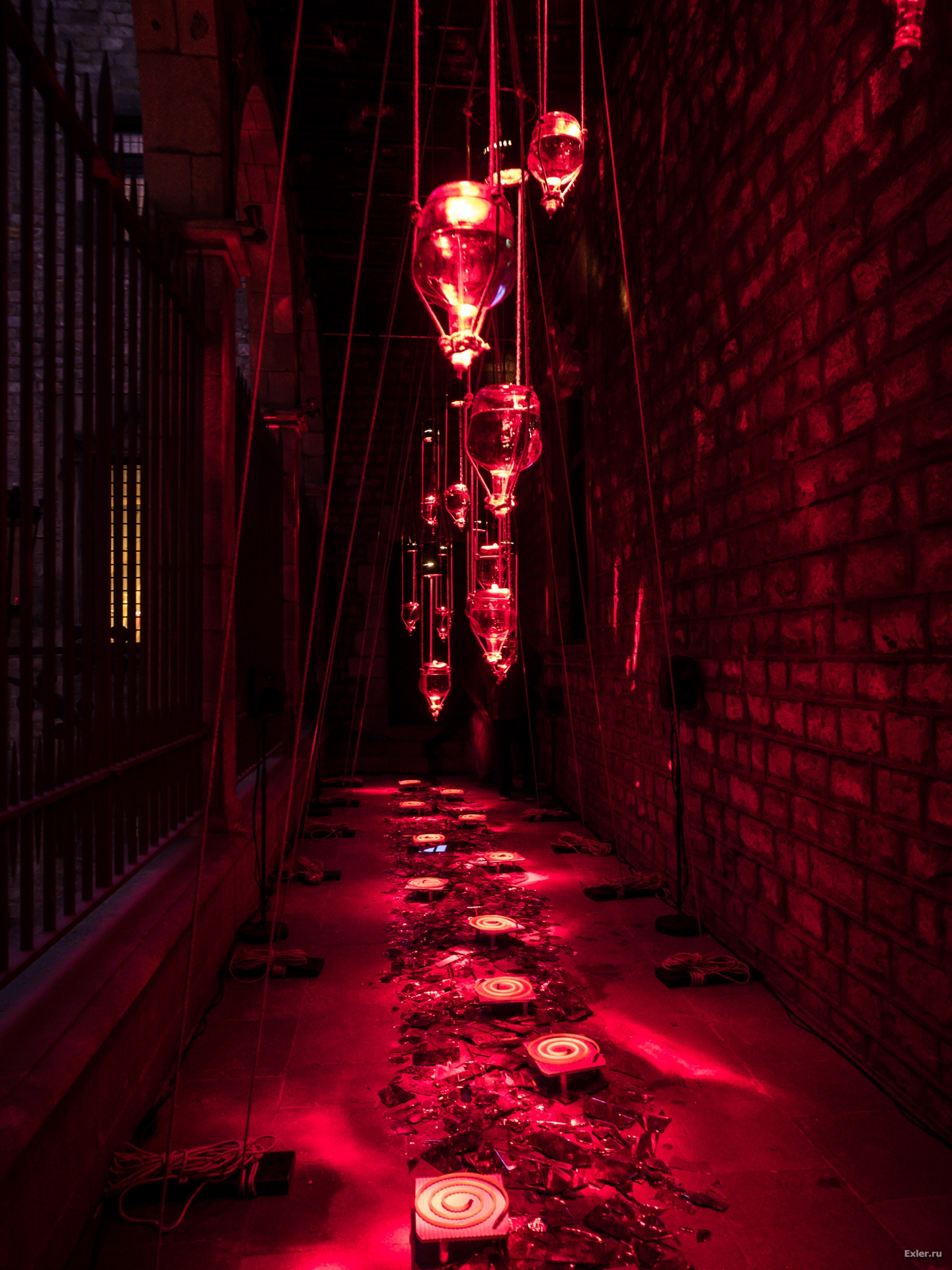 А эта инсталляция напоминает о жертвах инквизиции. Спирали снизу зажигают (мы этого не дождались) и в лампах сверху отражается красное пламя - символизирует кровь. Но и так выглядит красиво, без огня.