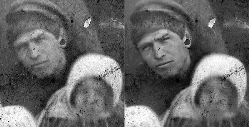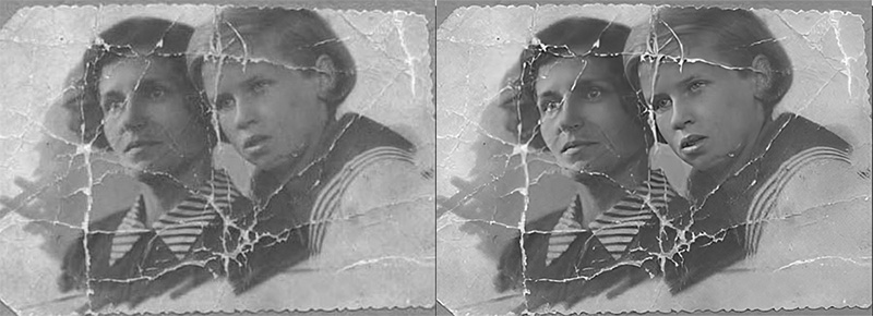 Еще одно, сильно поврежденное фото. Лица вытянули хорошо, но трещины все как были, так и остались. Хотя на примере в ролике алгоритм вроде бы с трещинами должен справляться.