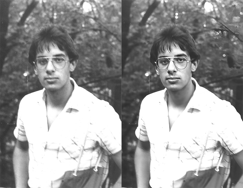 Сначала старое фото приличного качества, но не особенно четкое. Слева - оригинал, справа - обработка. (На фото, кстати, я сам собственной персоной.) А что - лицо очень прилично вытянули. Понятно, что я бы подобных результатов смог бы добиться в "Фотошопе", но на это ушло бы значительно больше времени, чем те несколько секунд, которые на обработку потратил данный инструмент.