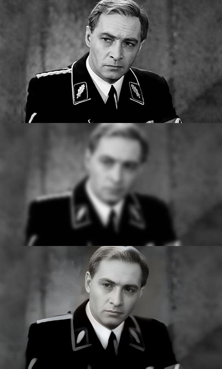 Но даже и при сильном размытии, как на этом примере со Штирлицем, можно вполне адекватно "восстановить" лицо, если напичкать нейронку качественными фотографиями Тихонова.