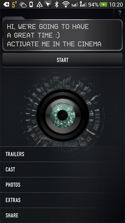 Главная хохма заключается в том, что под этот фильм разработано специальное приложение - под iOS (скачать) и под Android (скачать). Приложение запускается в начале просмотра фильма в кинотеатре, синхронизируется по звуковой дорожке и после этого запускает систему IRIS, которая фигурирует в фильме.