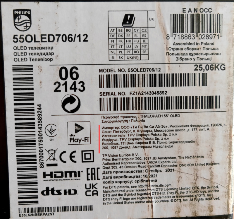 Выкидывал тут коробку из-под OLED-телевизора, который стал у меня монитором. Обратил внимание на этикетку, наклеенную на коробку. Ну, что собрано в Польше - ничего удивительного. Но вот откуда у телика, купленного в Испании, вдруг оказался российский импортер, да еще и из поселка Шушары - мне непонятно совершенно.