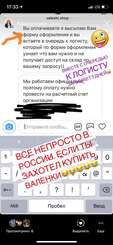 Оказалось, что культовый товар приобрести не очень просто. Сначала надо оплатить по реквизитам в банк по счету, причем обязательно указать, что это за валенки, иначе платеж не зачислят. Затем нужно запросить "форму оформления", после чего ВСТАТЬ В ОЧЕРЕДЬ К ЛОГИСТУ. Очереди у логиста ждать дней девять - ну, вы понимаете, валенки-то все хотят купить, а логист один. После того как логист вас примет и оформит заказ, вам нужно будет прислать им скрин карты, с которой вы оплачивали, потому что - а вдруг какой-то гад оплатил вместо вас и валенки вместо вас получит, правильно?
