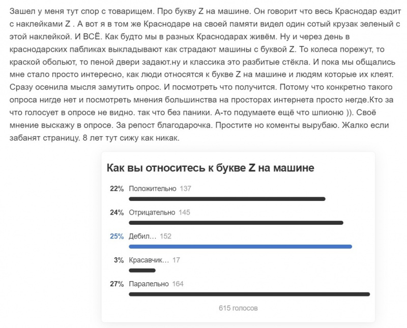 На сайте drive2.ru провели интересный опрос относительно буквы Z на машинах. Среди самых обычных водителей. На момент создания этого скриншота проголосовало 615 человек. Неплохая выборка. Опрос был вот здесь. Сейчас там уже опроса нет - администрация грохнула. (Даже такой вроде невинный опрос.) Но Интернет-то все помнит.