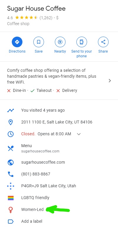 Ну ладно, про ЛГБТ поострили. В основном не очень остроумно, но как можем. По поводу кафешек принадлежащих женщинам (или управляемых женщинами) прикалываться будем? У гугла для них тоже есть специальный тэг.