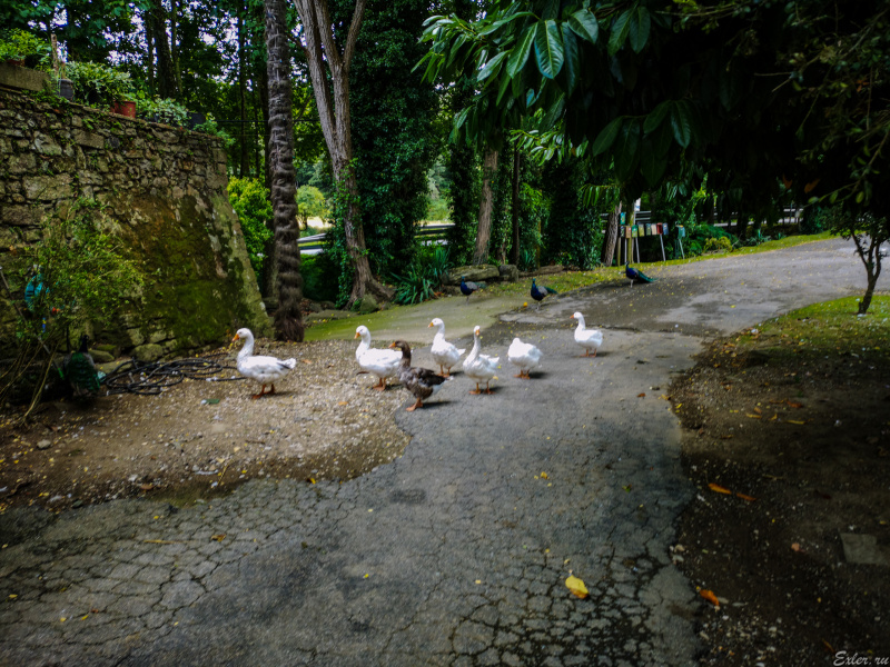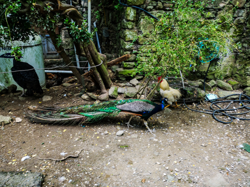 Рядом с ресторанчиком стадами бродят гуси, утки, курицы, петухи, павлины, индюки и индюшки. За загородкой вдалеке гуляют два страуса.