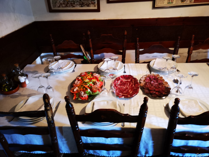 Хохма в том, что меню здесь нет. Вы приезжаете, садитесь за стол, а на стол начинают метать еду и напитки. На закуску - домашний салат, отличный хамон и шикарные колбасы. Потом приносят ризотто с грибами - это тоже на разогрев. После этого - здоровый поднос с улитками. Далее - основное блюдо: четыре здоровых миски с мясом - телятина, свиные ножки, петух, козленок, гусь или индейка. (Я даже публиковать это не буду, а то еще не время обеда, меня закопают.) Все это в диких количествах, мы не съели и половины, а среди нас была пара серьезных едоков. (Я к ним давно не отношусь, увы.) Если и этим не наелись, то хозяин также может принести блюдо здоровенных креветок на гриле. На десерт - вкусный торт. В ведерках со льдом стоит красное и белое вино (обычный столовый ординар, который в магазинах стоит 1,5-2 евро), которое хозяином приносится в неограниченных количествах. По запросу может принести каву (игристое).