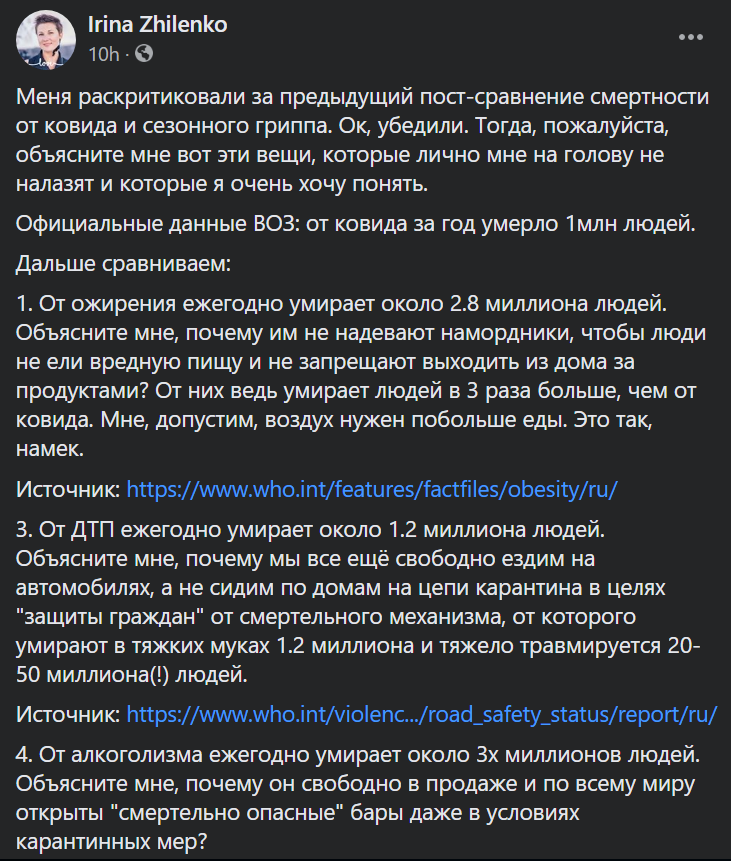От ковида умерло пока всего лишь 1 млн человек, при оценке 1-3% населения глобально заразились. Если заразятся 70%, вы сами можете оценить количество трупов. Собственно, все остальные ее пункты и основаны на этом 1 млн. При этом она еще забывает о нескольких миллионах, которых ковид оставил инвалидами.