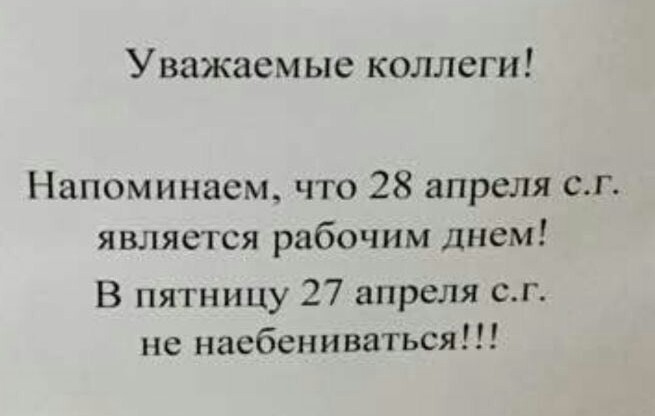 Сегодня суббота, она же предпраздничный понедельник (т.к. перенос с 30-го), она же пятница (т.к. последний рабочий день недели). Вот так всё сложно...