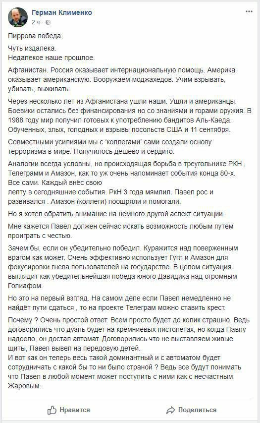 Ага, верх адекватности. Дуров должен приползти на коленях, “потому что Афганистан”