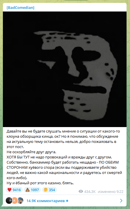 Нет, я еще с ума не сошел. Это журналист Роман Супер выложил кусочек интервью Красовского, которое он записал в 2015 году. Интересно было послушать. А по поводу того, что Красовский не захотел быть их собственностью - ну, тогда не захотел, а потом захотел, делов-то. Теперь один из главных, и один из наиболее мерзких подмахивающих у каннибалов. Жизнь - она штука сложная. Непростая. По-разному может повернуться.