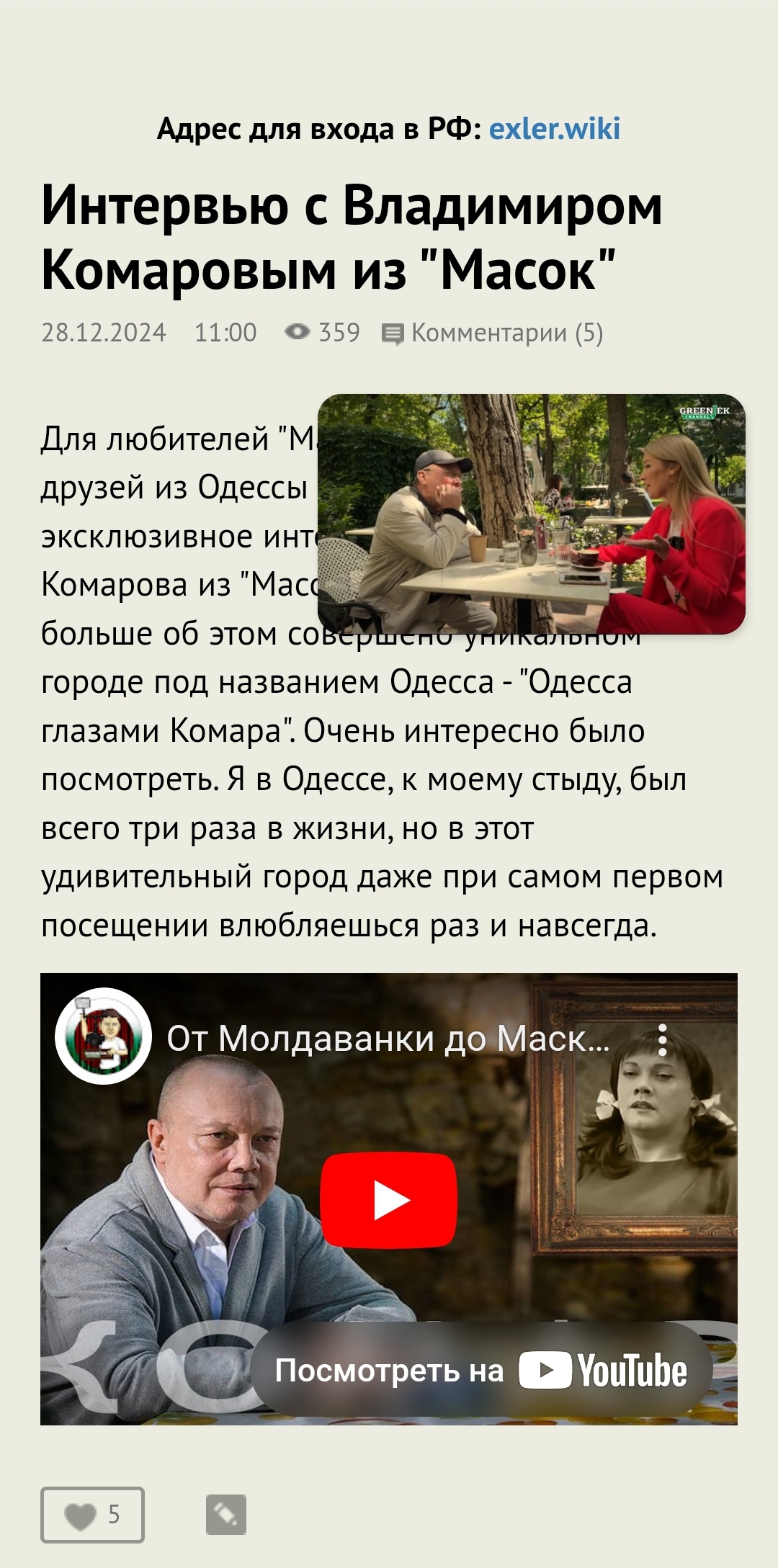 Для любителей "Масок Шоу": на канале моих друзей из Одессы GreenJek channel - эксклюзивное интервью Владимира Комарова из "Масок Шоу". Там вообще больше об этом совершено уникальном городе под названием Одесса - "Одесса глазами Комара". Очень интересно было посмотреть. Я в Одессе, к моему стыду, был всего три раза в жизни, но в этот удивительный город даже при самом первом посещении влюбляешься раз и навсегда.