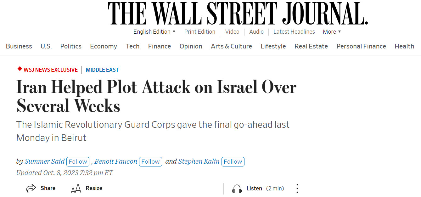 Вот, например, в New York Post статья о том же докладе по Ирану - "Iran helped plan devastating Hamas attack on Israel, gave green light last week after months of preparation: report".