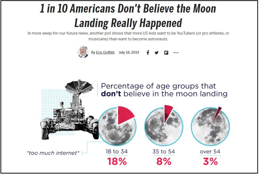В США столько-то процентов населения не верит, что астронавты в конце 1960-х побывали на Луне..