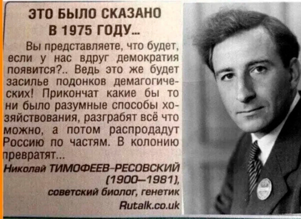 Учитывая жизненный путь Тимофеева-Ресовского, его мнение о демократии имеет нулевую ценность, поскольку он её просто вообще не видел.
