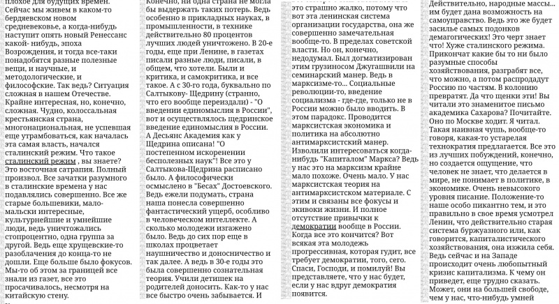 Ну, судя по приведённому расширенному отрывку, это выглядит несколько по-другому, но вовсе не принципиально. Он ведь там под конец за критику западного общества принялся. Правда стал скакать между политическим устройством и экономическим укладом. И тут, на самом интересном месте всё обрывается. Мне так и осталось неясным, критикует ли он стремление к демократии в специфике советской общественной среды или концепцию демократии вообще.