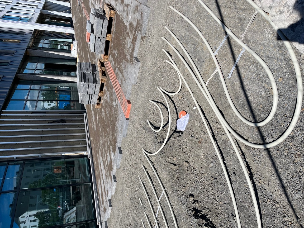 Порылась в своём мобильнике, здесь пара моих фото. На одной из них укладывают отопление в асфальт. Интересно было бы пройтись по этому тротуару зимой. Фотка с трубами почему-то загружается криво, но смысл понятен.