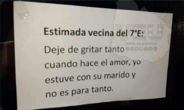Табличка в подъезде: "Дорогая соседка с 7 этажа, перестаньте так кричать, когда занимаетесь любовью. Я была с вашим мужем, ничего особенного".