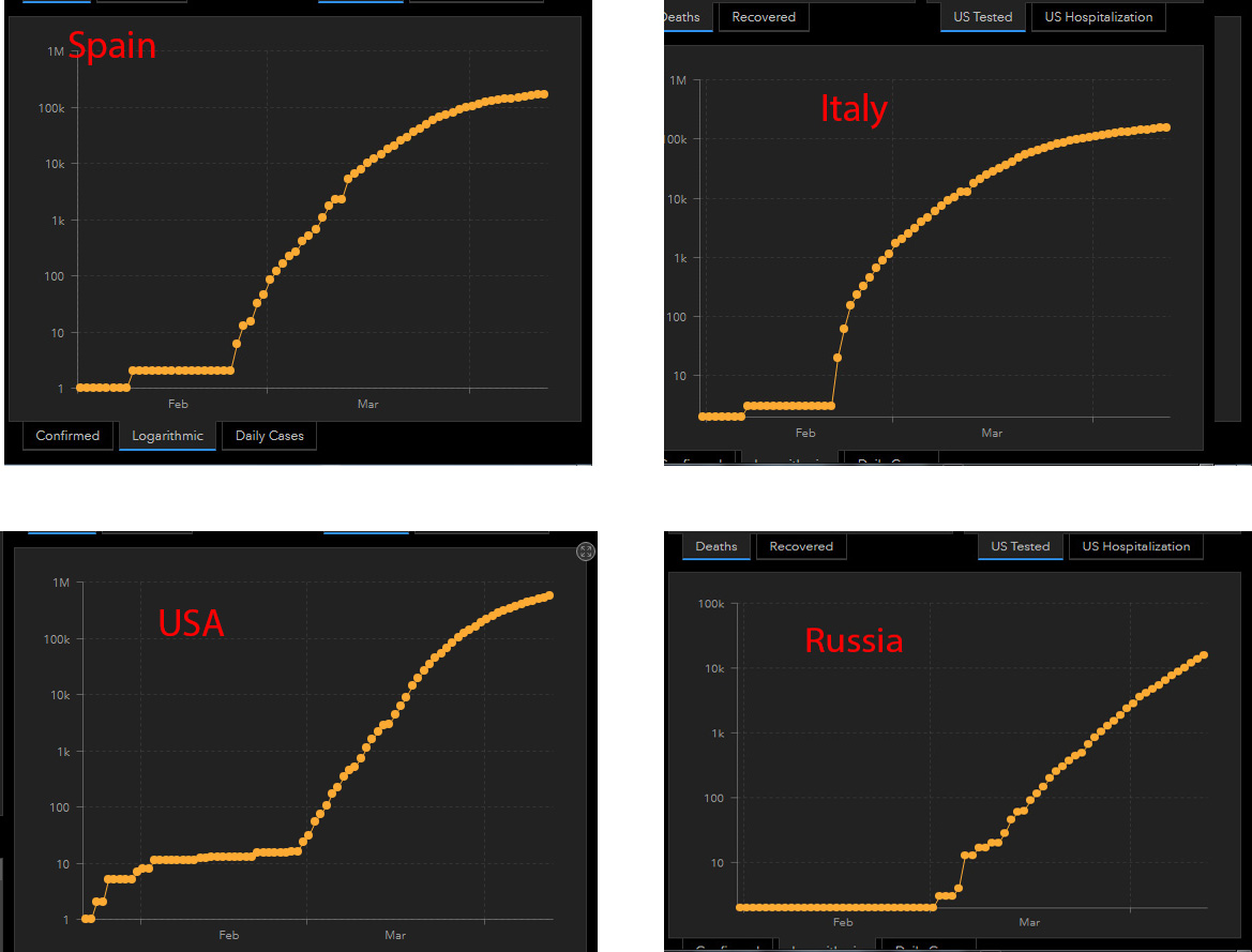 Наклон логарифмической кривой к горизонтали говорит нам о характере происходящего. Это легко понять, если посмотреть на разные страны.