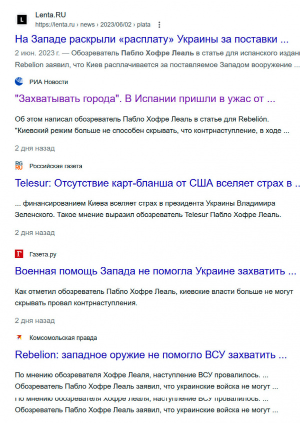Впрочем, что этот "Пабло Леаль" (кто его знает, кто он вообще в реальности такой) сидит на зарплате у Симоньян, как и остальные пропагандоны - это было видно по обычному запросу в Google: он там в каждом пропагандистском издании постоянно упоминается.