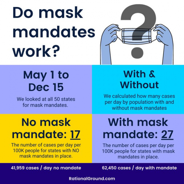 В Штатах есть такой центр обмена данными о COVID-19 Rationalground.com. Они провели большое исследование с целью доказать эффективность ношения масок. Как они его проводили? Сравнивали показатели заболеваемости в различных штатах: тех, где ношение масок было обязательным и где ношение масок было необязательным. Причем охватили данные большого периода с 1 мая по 15 декабря 2020 года. Для получения достоверной статистики в тех штатах, где маски сделали обязательными, статистика заболеваемости начиналась учитываться только через две недели после введения требования - чтобы маски начали работать и влиять на заболеваемость.