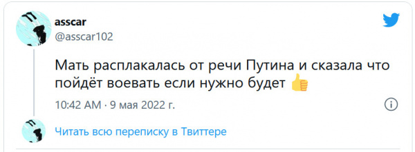 В издании "Радио Свобода" собрали реакции различных людей в Сети на эту выдающуюся и, вне всяких сомнений, историческую речь президента. От всяких марковых-холмогоровых (ну, с этими все понятно) до подлых либералов и пятой колонны.