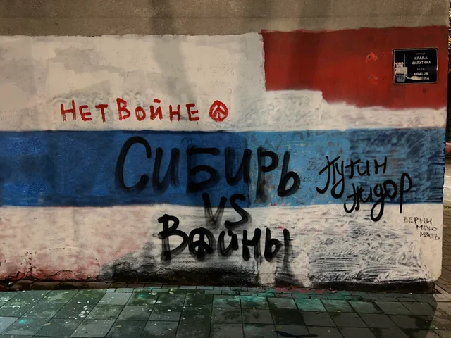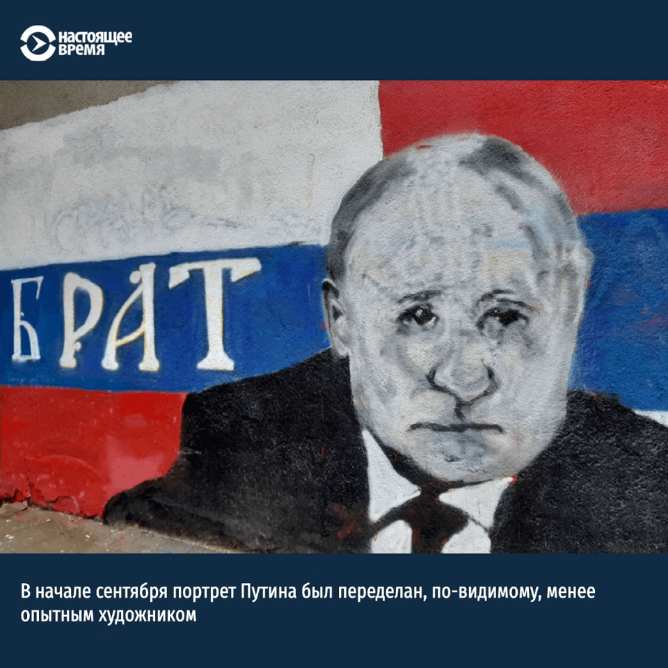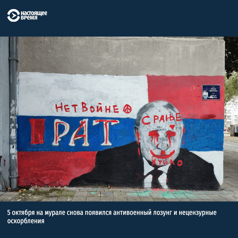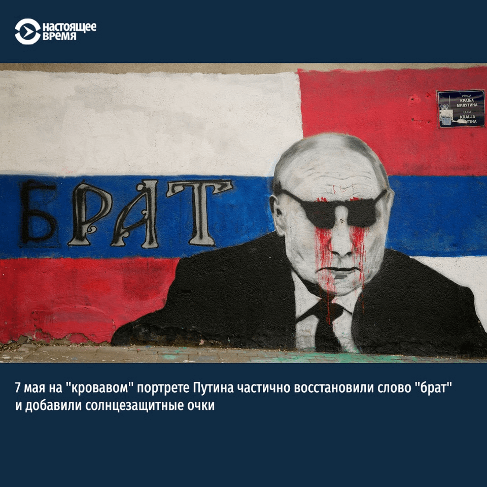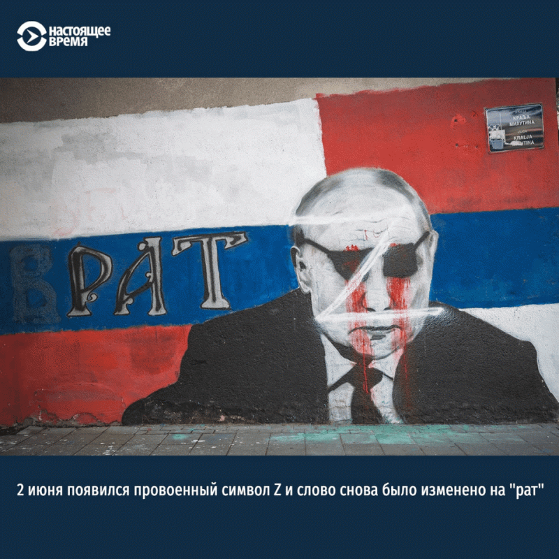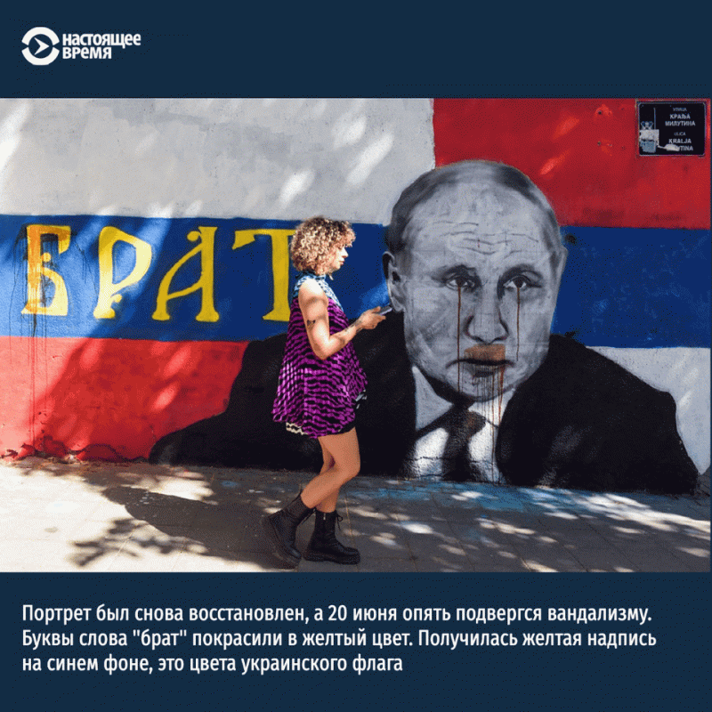 Мурал с Путиным появился 5 марта на одной из центральных улиц Белграда (Сербия) после чего мурал претерпел ряд последовательных превращений - отсюда.