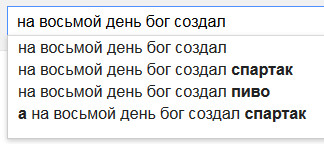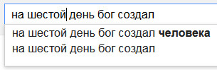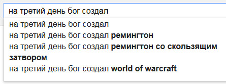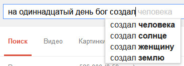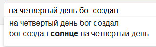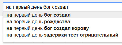 может, закон малых чисел сработал, так как в русском гугле еще мало статистики по запросам накопилось. Думаю, если бы по английски искал, было бы не так смешно.\n Вот мои результаты на первый день, в порядке появления (WTF with the dog though?): \n the dog \n the light \n the heavens and the earth \n the man