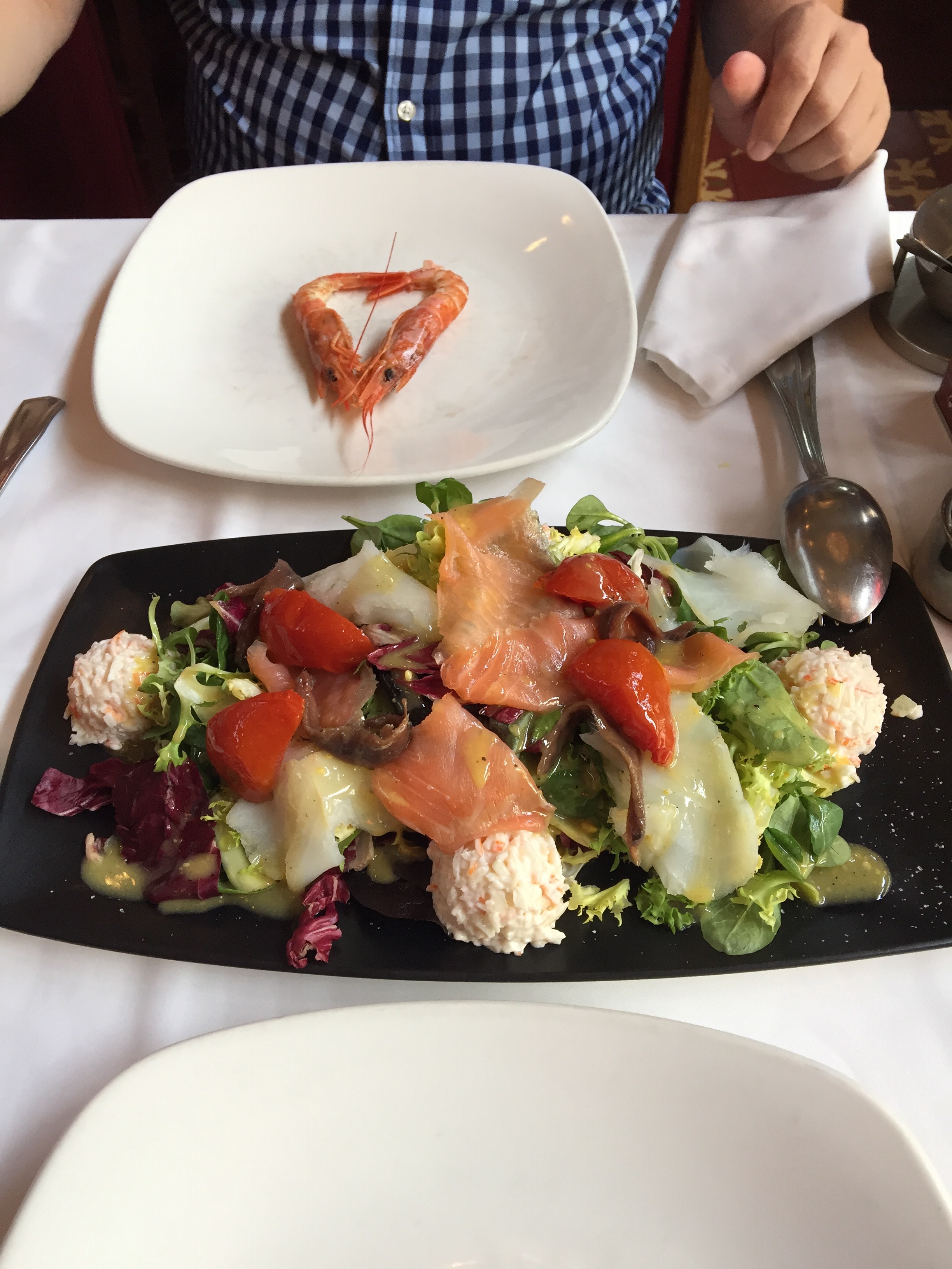 Салат с лососем, нежнейшей треской и крабами был вкуснейший, но я был такой голодный, что сначала его слопал (тут порции здоровенные, мы с женой заказываем одну порцию на двоих), а потом сообразил, что надо было сначала сфотографировать.