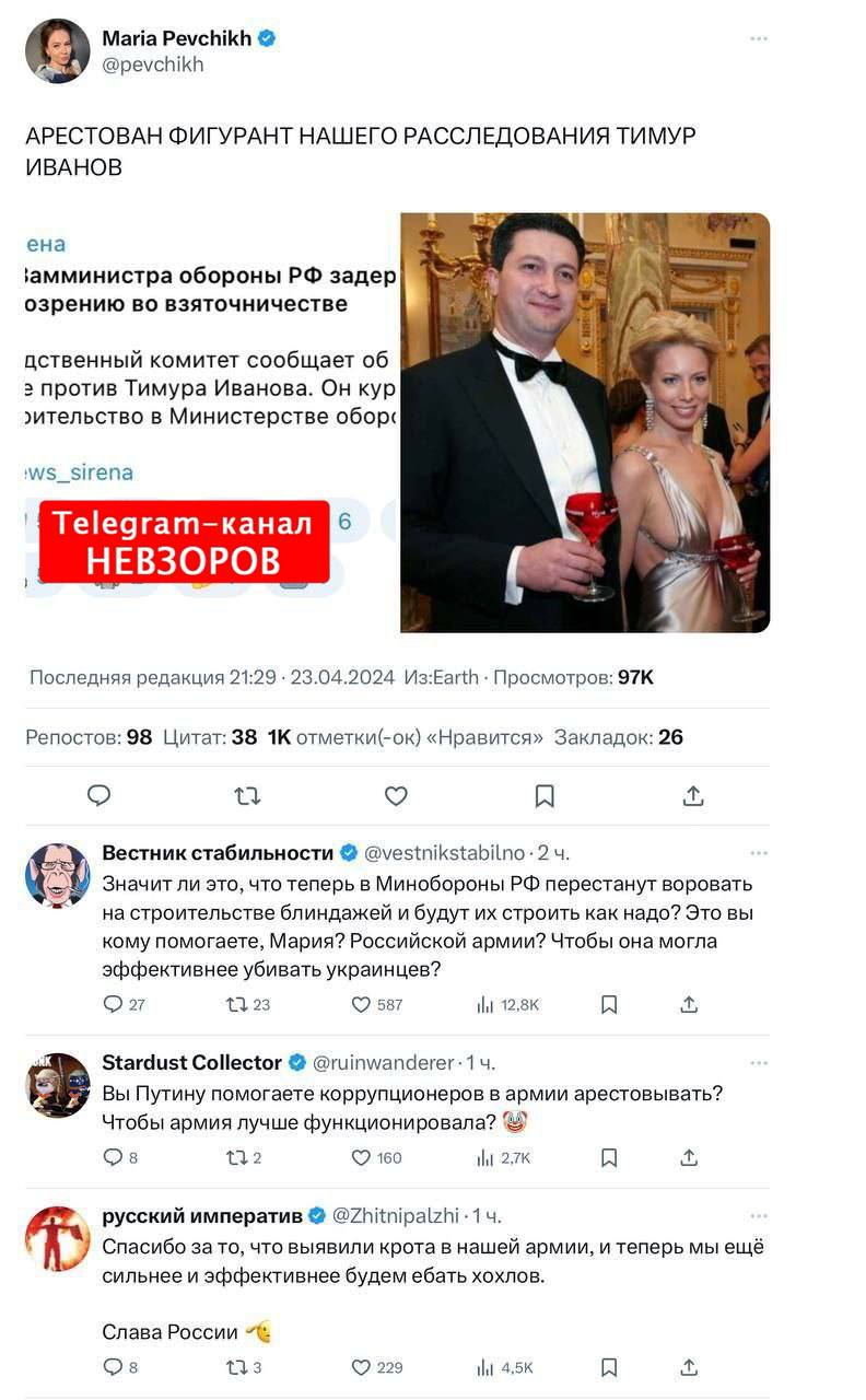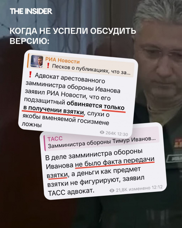 Конечно, обсуждая громкую отставку в Минобороны, можно и даже нужно рассматривать и конспирологические версии об атаке на Шойгу или войне околокремлевских кланов. Но явно не стоит сбрасывать при этом со счетов самую очевидную версию - прямо связанную с обязанностями арестованного замминистра и с войной, которую продолжает Путин." (с)И.Преображенский DW