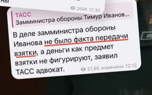 «Взятка — это для публики. Пока говорить публично о госизмене не хотят — скандал большой: все-таки замминистра обороны», — заявил один из собеседников издания.