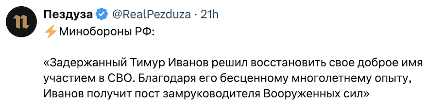 В итоге, Тимур Иванов в глазах значительной части российских военных мог стать собирательным образом "вредителя". Такого, что хуже предателя и виновен во всем, от нехватки снарядов и испортившихся консервов, до невзятых городов и потерянной техники.