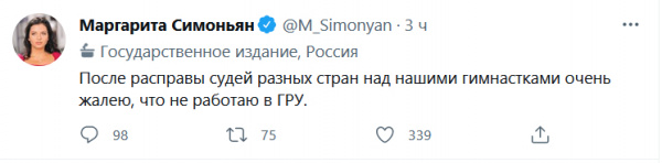 А симоньянша-то чего грустит? Зачем ей на работу в ГРУ? Пускай напишет заявление, чтобы ей со склада выдали две склянки "Новичка", и едет в Токио судей травить, делов-то. А то в Твиттере-то все большие вояки, куда деваться.