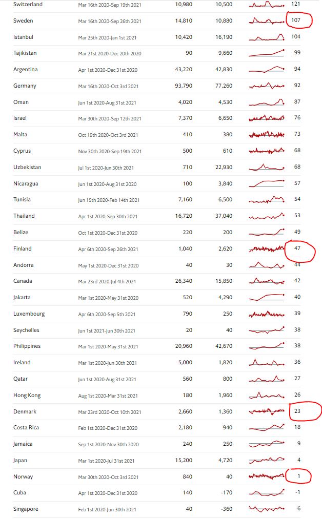Кстати, интересно посмотреть, на каком месте находится единственная страна, правительство и специалисты которой не стали устраивать пандемию паники и страха, а практически единственные в мире повели себя разумно и взвешенно, причем не прогнулись и не поддались на истерические вопли по их поводу, доносившиеся изо всех остальных стран.