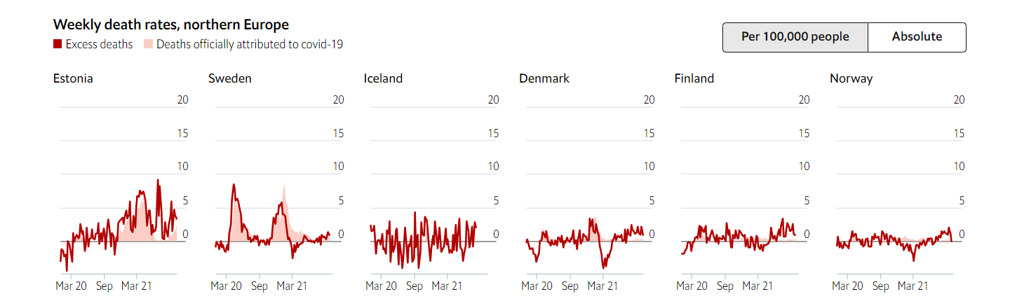 "В странах Северной Европы в целом уровень смертности во время пандемии был значительно ниже. В некоторых северных странах почти не было лишних смертей. Исключение составляет Швеция, которая ввела на континенте наименее ограничительные меры социального дистанцирования во время первой волны."