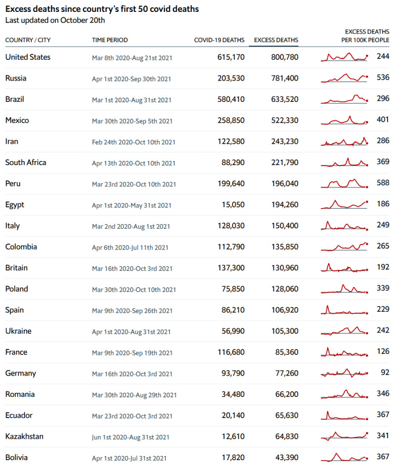 Вот первая двадцатка по избыточной смертности. (Данные по России, как мы прекрасно понимаем, явно недостоверные и наверняка сильно занижены, причем это не теоретическое предположение, а вывод по результатам различных исследований.)
