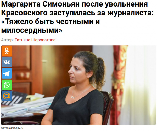 Во-вторых, очень искренне выглядит адресат извинений Красовского. Точная цитата: «Я прошу прощения у всех, кто обалдел от этого. Прошу прощения у Маргариты [Симоньян], у всех, для кого это показалось диким, немыслимым и непреодолимым. Надеюсь, вы меня простите.». Ну то есть де-факто извинился он (только) перед начальством. И лишь об одном сожалеет, о единственном просит — чтобы ему дали вернуться к работе и тем привилегиям, которые с ней связаны.