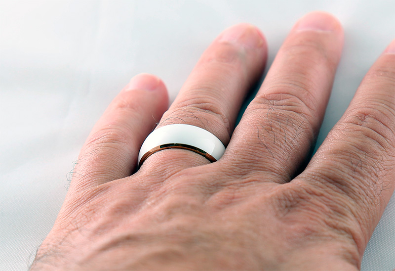 Внутри - кольцо с двумя NFC-чипами, расположенными на противоположных сторонах кольца. На одной боковой грани специальные метки отмечают местонахождение чипов.