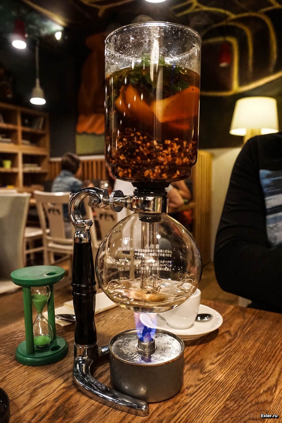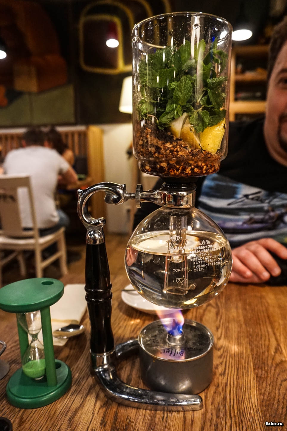 Подается вот в таком прикольном устройстве. Снизу поджигается горелка, вода нагревается и постепенно начинает ползти вверх, к Солнцу, заваривая подготовленные ингредиенты.