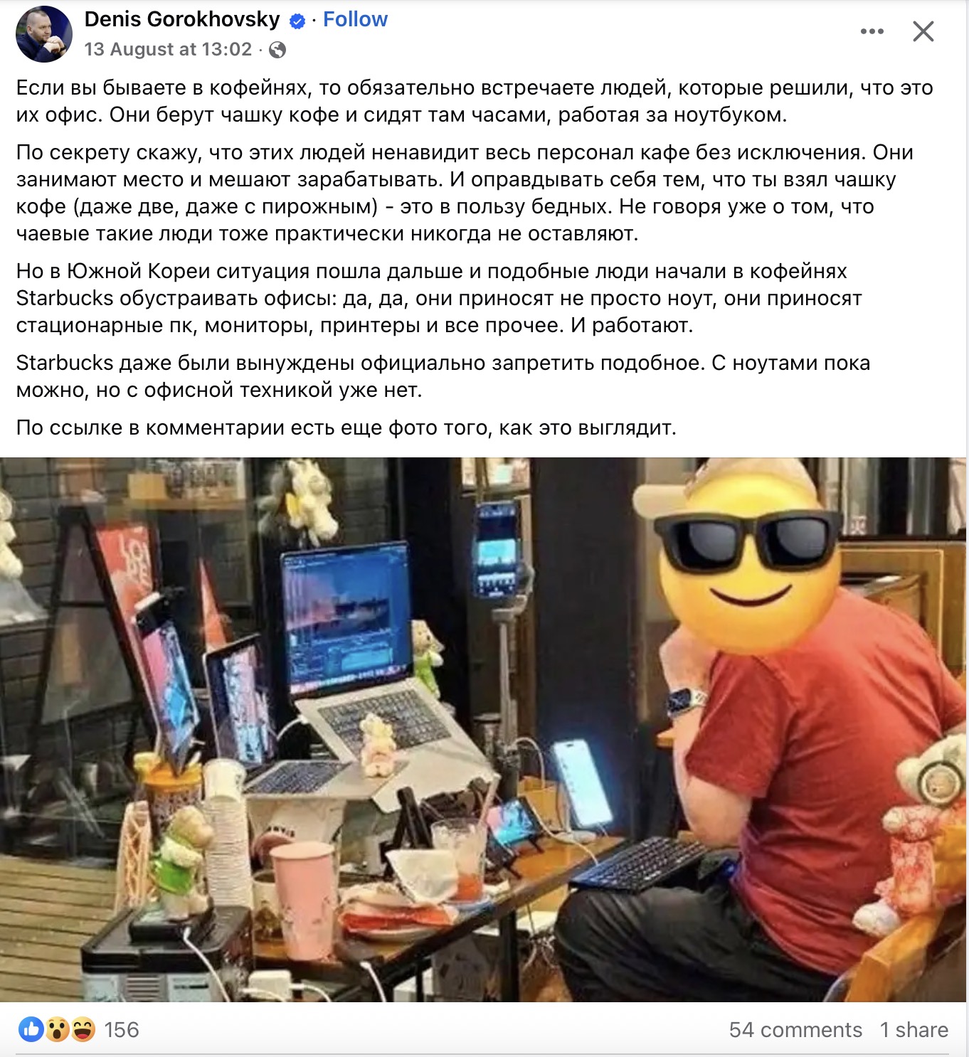 Помнится, ещё всего несколько лет назад российские ИТ и прочие специалисты кидались на меня за то, что я называл неуместным сидение в кафе с ноутбуком и одной чашкой кофе целый день. Мол, это кафе ещё невероятно выгодно и выгонять за такое никак нельзя!