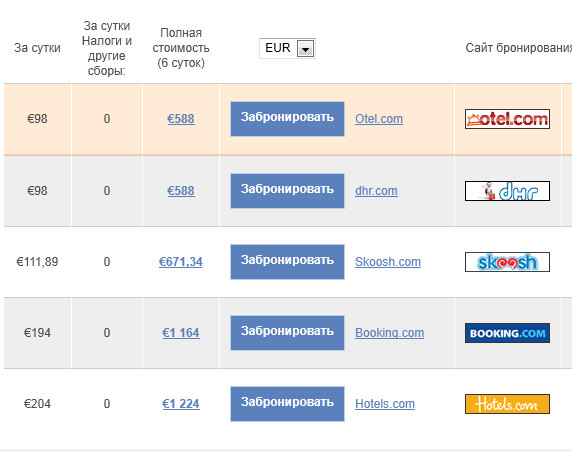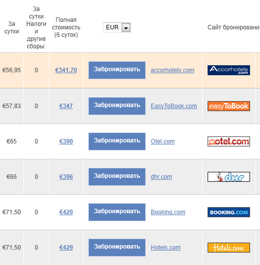 После этого наступает самое интересное. Нажимаем на кнопку с ценой и получаем подборку самых низких цен на этот отель. На скриншоте хорошо видно, насколько существенной получается разница при бронировании через различные сервисы - от 57 евро за сутки до 71,5 евро. Обратите также внимание на то, что популярный Booking.com выдает вовсе не лучшую цену.