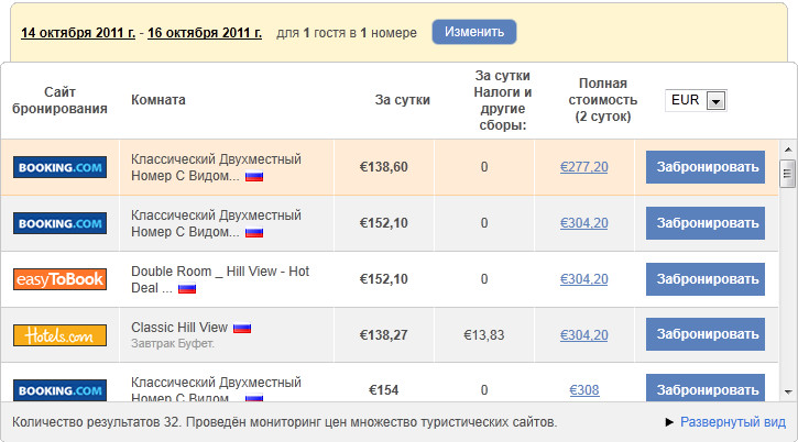 Ну и далее остается выбрать нужный сервис (где 56,95 евро) и щелкнуть по кнопке "Забронировать" - вас перенаправят на сайт бронирования, где вы и сделаете заказ. (Только не забудьте посмотреть, какие предложения возмещаемые, а какие невозмещаемые: нередко имеет смысл заплатить немного больше, но иметь возможность отказаться от номера.)
