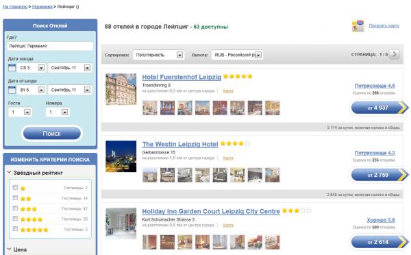 Второй вариант - вводим конкретный отель (я для примера ввел Leipzig Marriott Hotel ), и по нему на заданные даты выдается список.