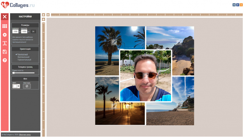 Понадобилось коллажик сделать из нескольких фотографий. С "Фотошопом" возиться не хотелось, поискал онлайновые сервисы. Зашел в первый же попавшийся Mycollages.ru. Бесплатный, очень простой, отлично продуман интерфейс, есть куча различных шаблонов (фоторамки также имеются), коллаж создается буквально за несколько секунд в простом и удобном редакторе, который однако делает все что нужно (можно выбрать нужную часть фото для коллажа, подредактировать фото). Настраивается фон коллажа, рамки, скругление углов. Сохраняет в нужном формате и даже никакого водяного знака не ставит. Можно также создавать свои форматы коллажей.