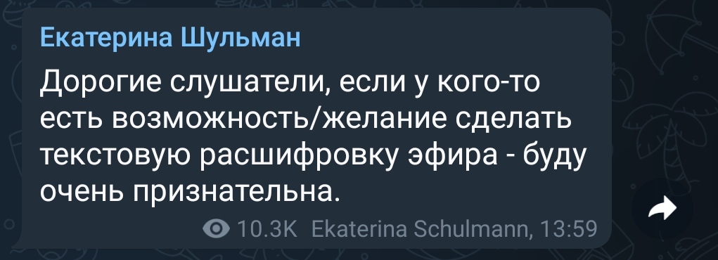 Вот поэтому никогда не могла слушать Шульман. Если бы где-то выкладывали расшифровку её подкастов а лучше даже краткий конспект...