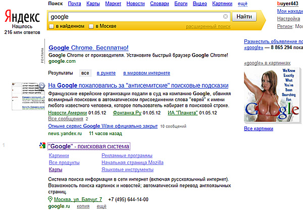 На яндексе напротив ссылка на сам Гугл слева стоит циферка 1. То бишь выдача в первой строке. А все что выше - это так... контекс...как ее там...ная ссылка.