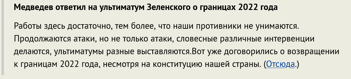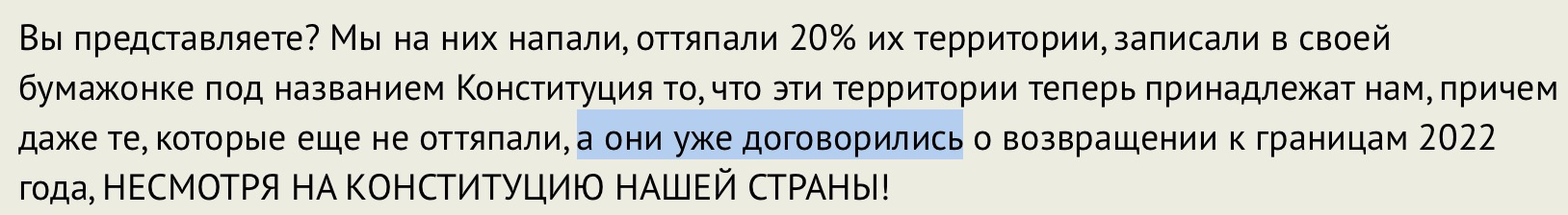 Вы представляете? Мы на них напали, оттяпали 20% их территории, записали в своей бумажонке под названием Конституция то, что эти территории теперь принадлежат нам, причем даже те, которые еще не оттяпали, а они уже договорились о возвращении к границам 2022 года, НЕСМОТРЯ НА КОНСТИТУЦИЮ НАШЕЙ СТРАНЫ!